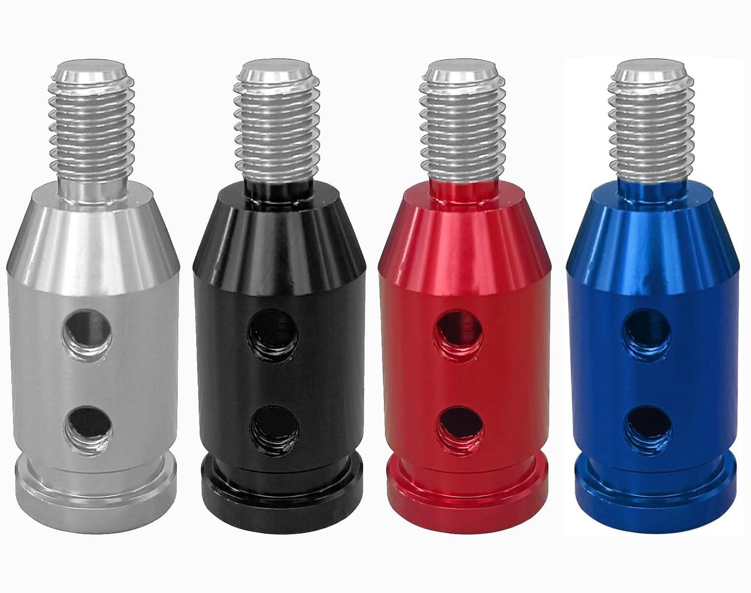 The top of the adapter is precision-machined with a 3/8"-16 thread, making it compatible with most beer tap handles. The adapter base is designed for universal fitment on threaded and non-threaded shifters, ensuring a secure and snug fit. To accommodate different shifter sizes, the package includes four rubber fitment sleeves with inner diameters of 0.31"/8mm, 0.39"/10mm, 0.43"/11mm, and 0.47"/12mm.