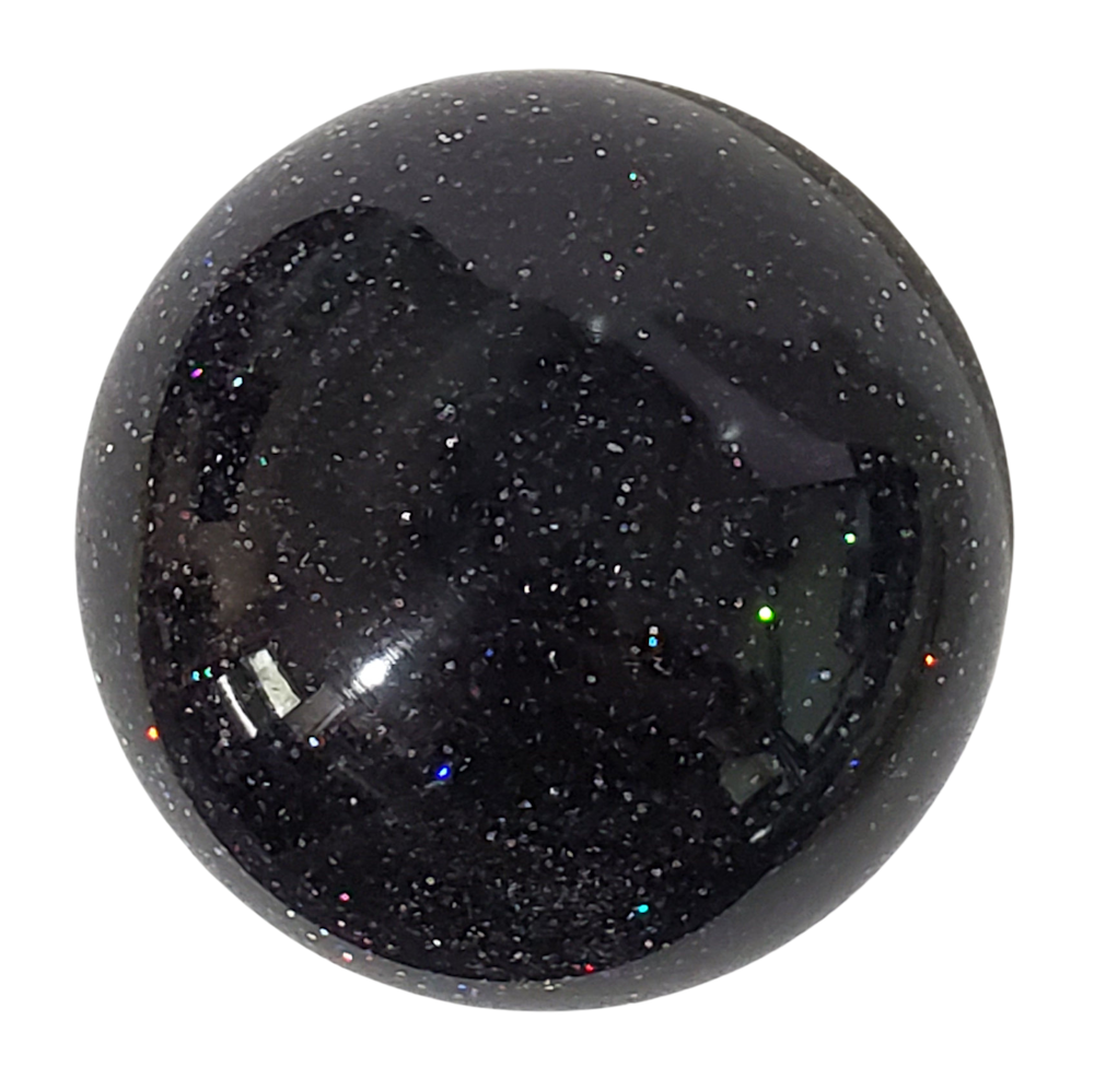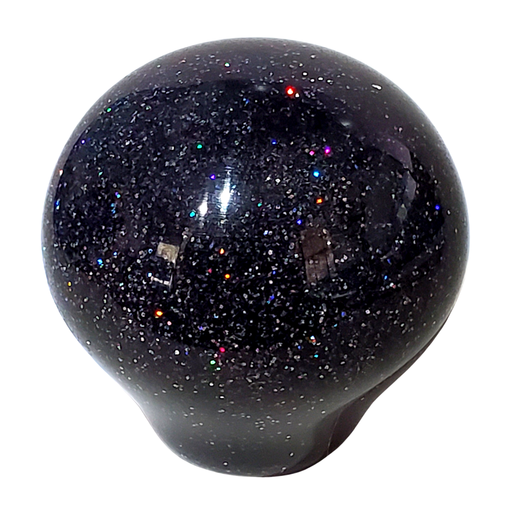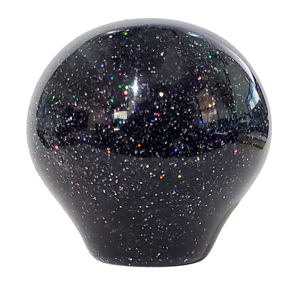 This shift knob was crafted with epoxy resin and black holographic color-changing glitter that shimmers and sparkles in bright light. The knob is just under 2" in diameter (1.98"), is 1.96" tall, and weighs 2.4 ounces (68 grams).
