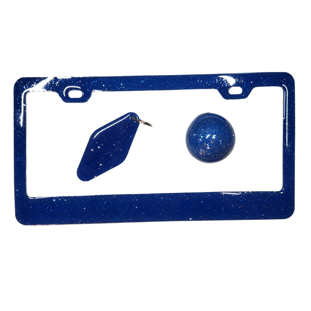 Blue and Chrome Flake Shift Knob, Keychain, License Plate Frame