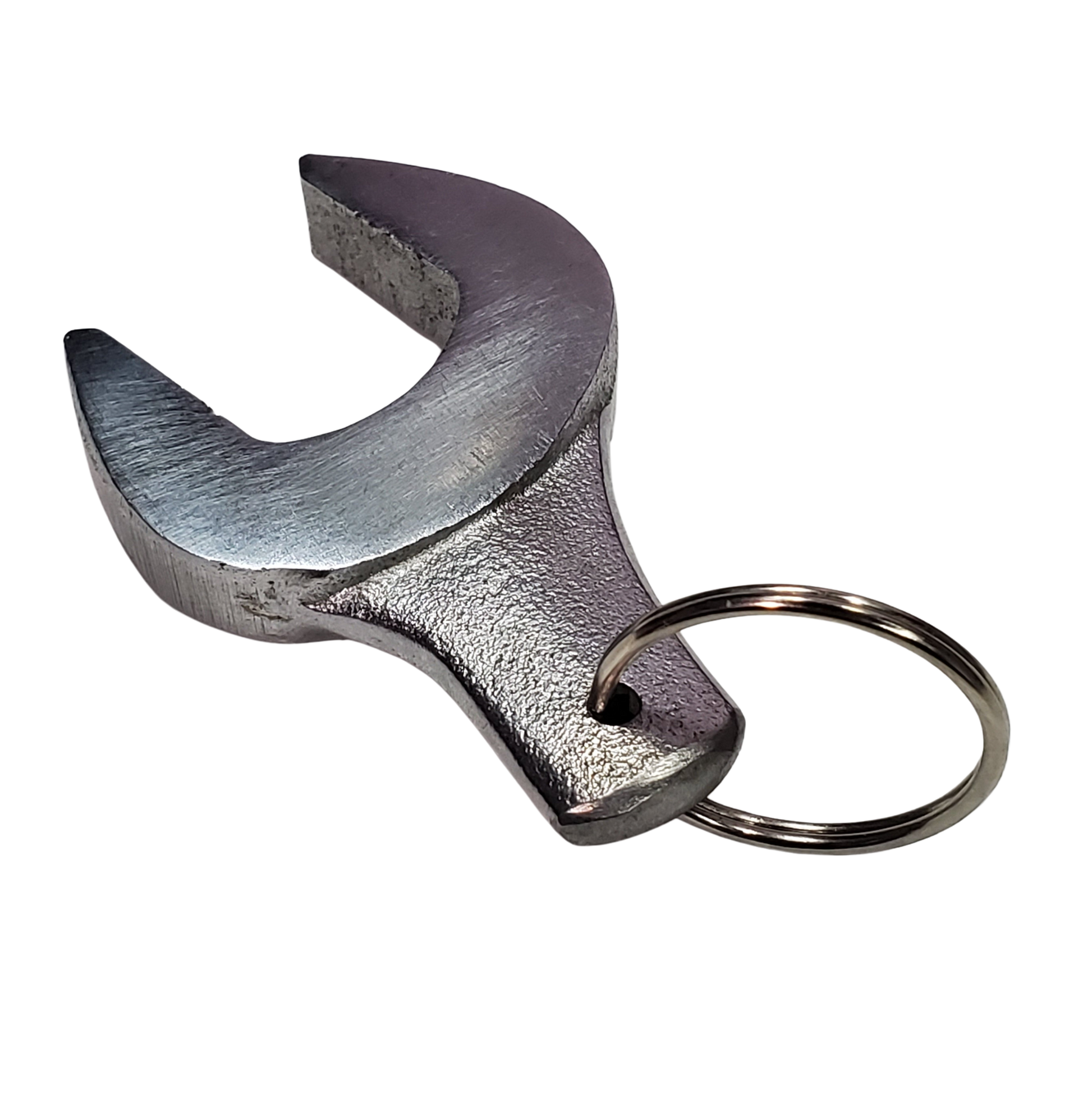 This was cut from a well-used CRAFTSMAN 5/8" x 3/4" Open End Wrench. The original part number for this tool was V-44582. It's a nice, weighty keychain that will last long enough for your kids' kids to use it.