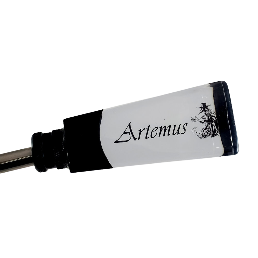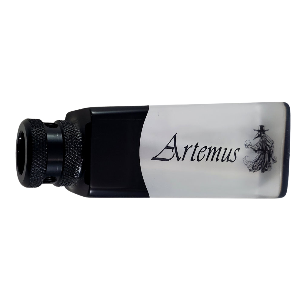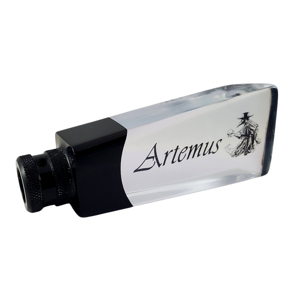 This custom column shift knob was crafted for Irish Outlaw Garage's 1968 Pontiac Superior Ambulance, better known as Artemus. The knob was created with a standard non-threaded adapter and black and clear resin with the Artemus logo floating in the middle.