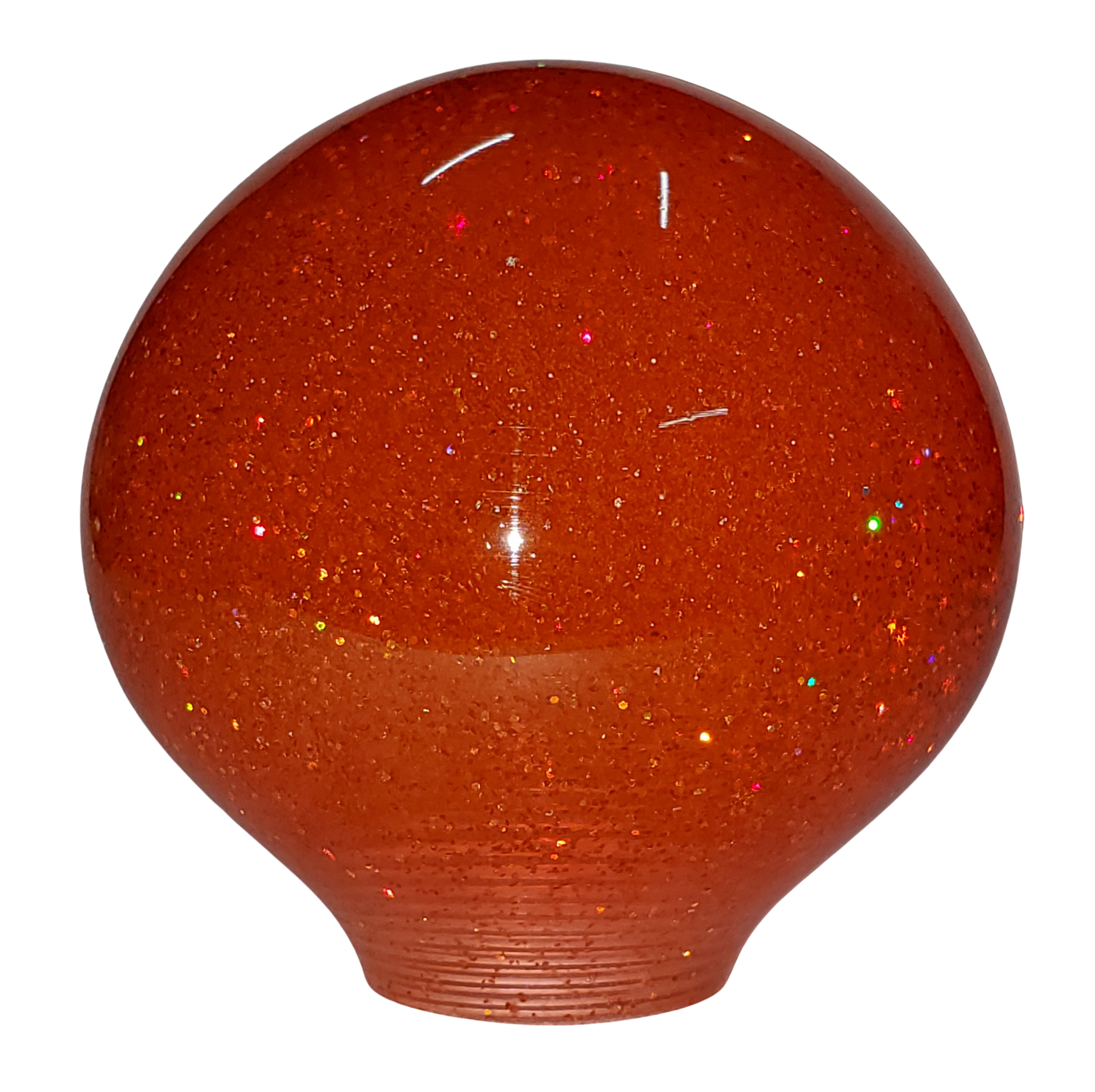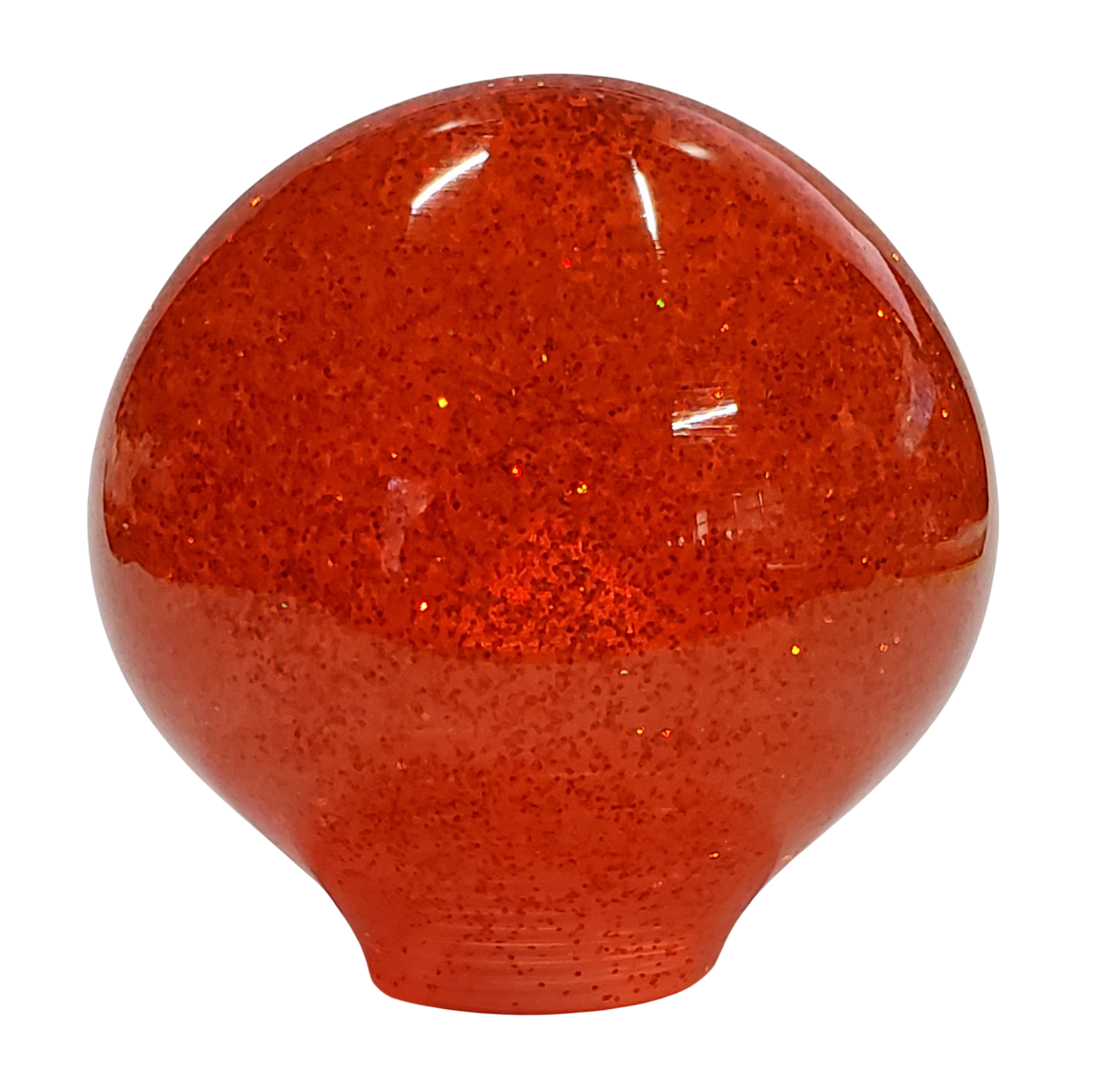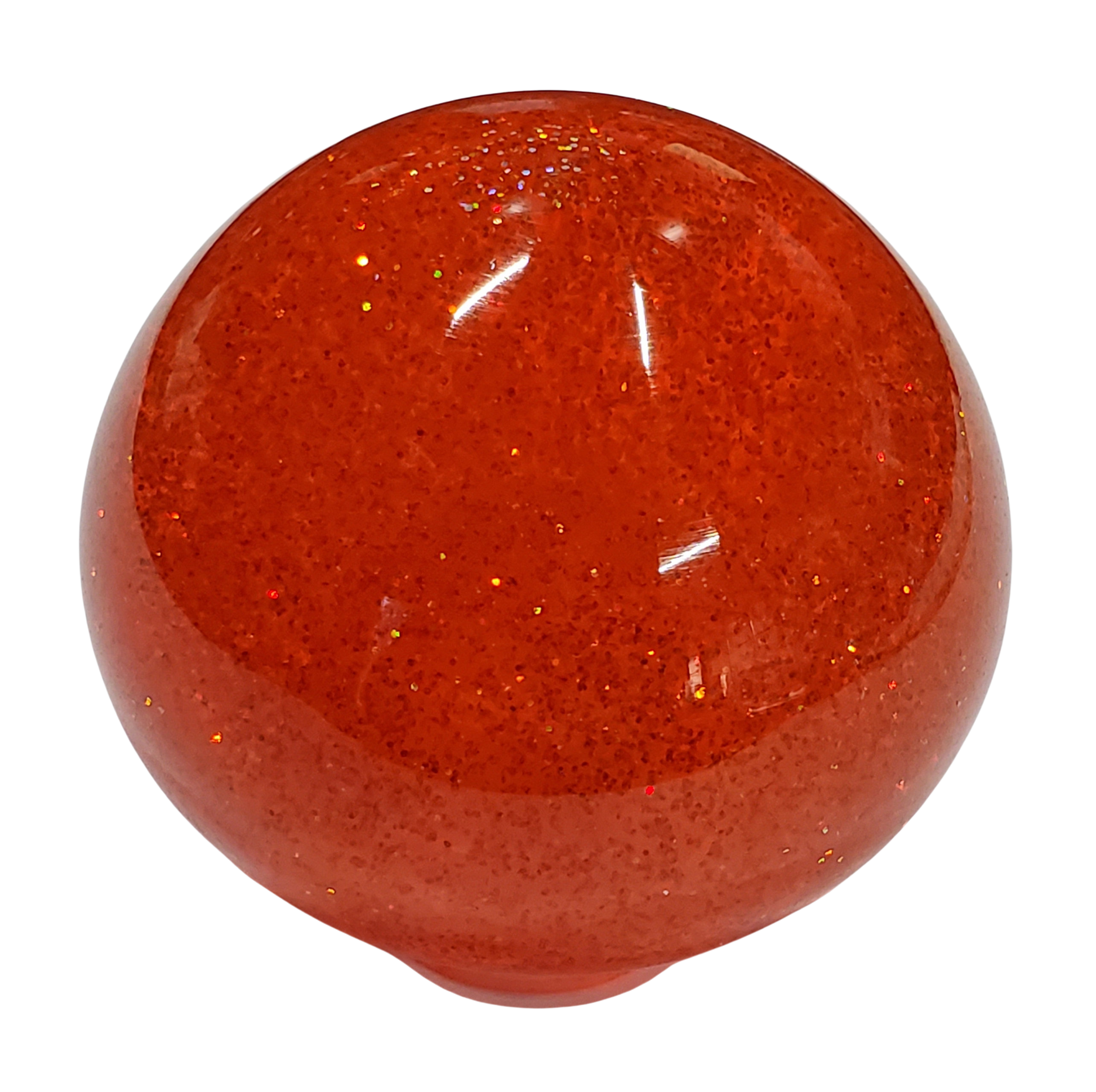 This shift knob was crafted with epoxy resin and a smattering of red holographic color-changing glitter that shimmers and sparkles in bright light. The knob is just under 2" in diameter (1.9") and is 1.92" tall. The effect from the glitter is subtle and shows best when direct sunlight hits the knob.