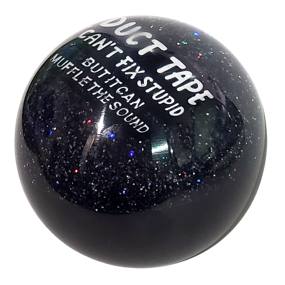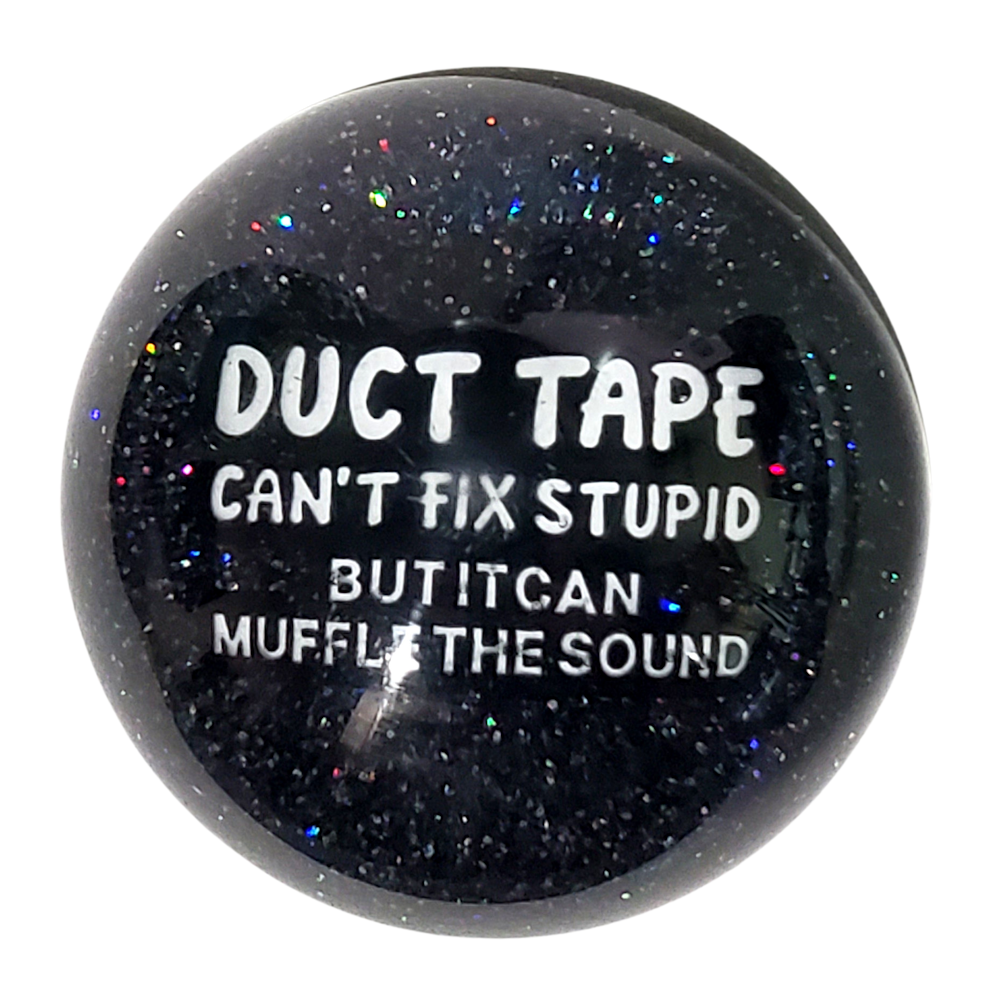 This is a black and holographic glitter sphere shift knob with a lapel pin embedded that reads, "DUCT TAPE Can't Fix Stupid But It Can Muffle The Sound." The shift knob measures 2.07 inches in diameter and weighs 3 ounces (87 grams).