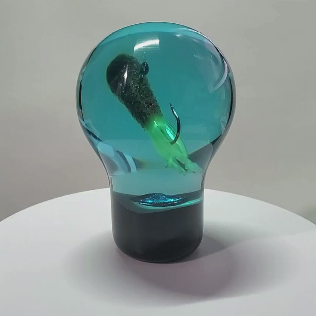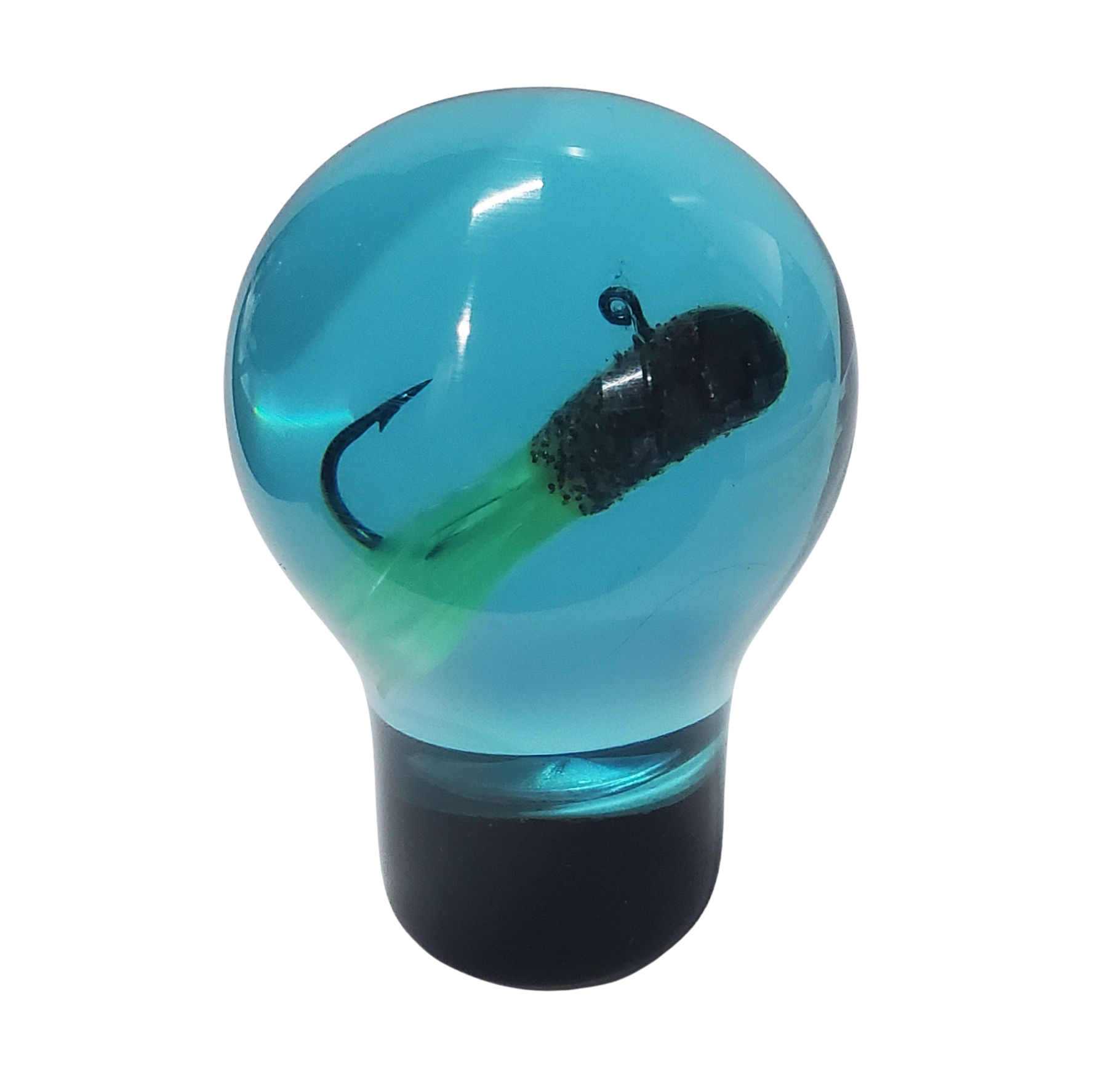 This is an epoxy resin shift knob with a fishing lure slung from 20lb test line that'll remind you of what you'd rather be doing than most things. The shift knob measures 2.2 inches in diameter, is 3.25 inches tall, and weighs 4.9 ounces (138 grams).
