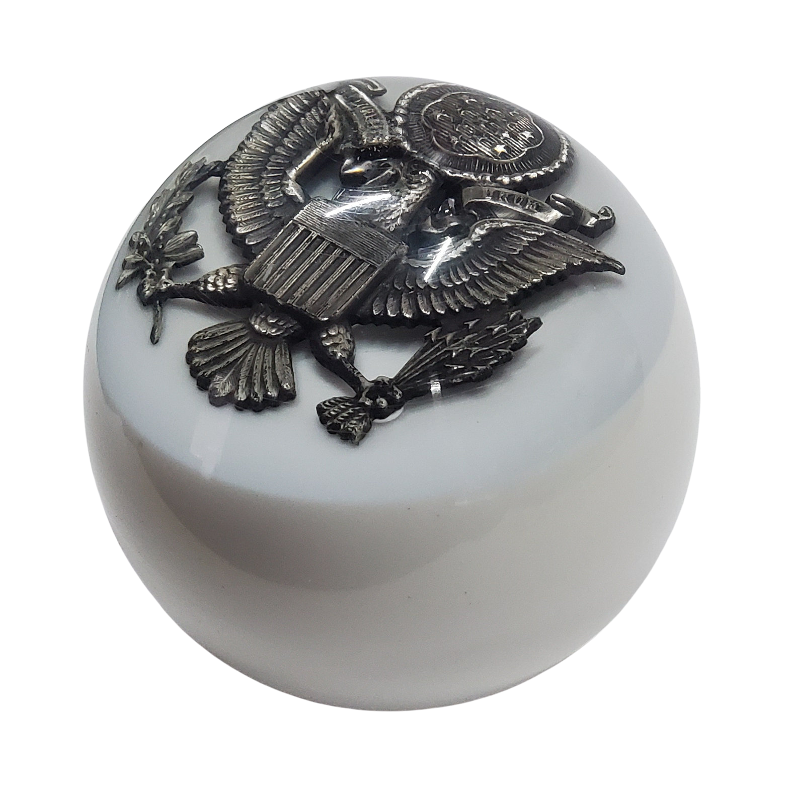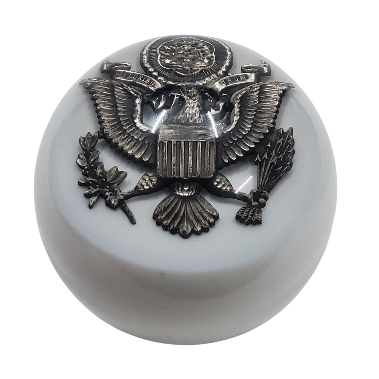This shift knob was crafted from an old uniform pin that's been left in as-acquired condition. The Great Seal is a national symbol of the United States — If you think you've not seen it before, look at the back of a one-dollar bill. The seal was largely designed by Charles Thomson, secretary of the Continental Congress, and William Barton, and first used in 1782. The seal is currently used on official documents — including United States passports—military insignia, embassy placards, and various flags.