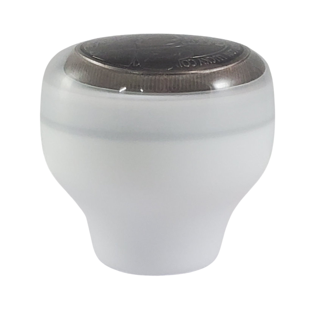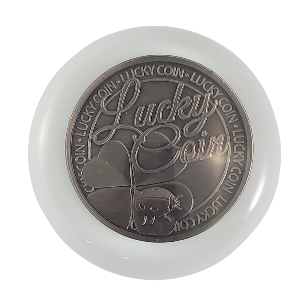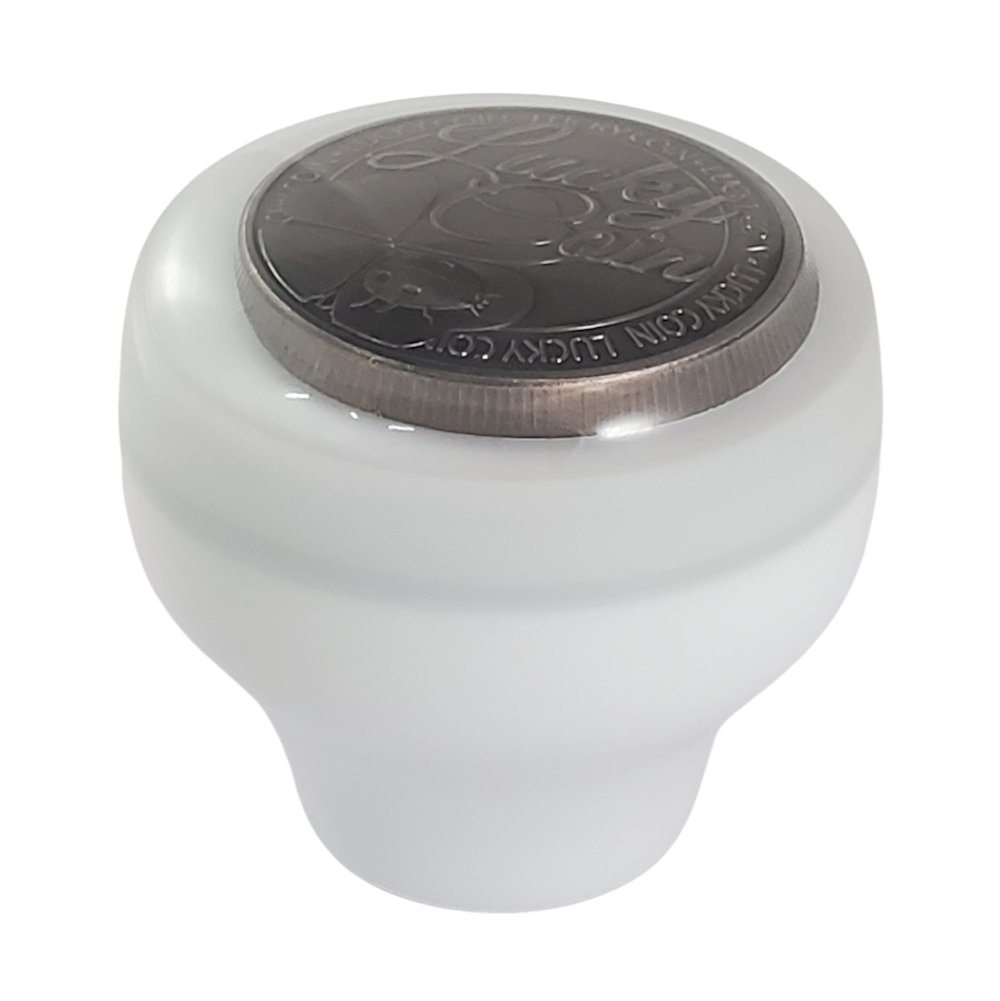 This is a white epoxy resin shift knob with a Lucky Coin with a four-leaf clover embedded atop the knob. The shift knob measures 2.3 inches in diameter, is 2.3 inches tall, and weighs 5 ounces (143 grams).