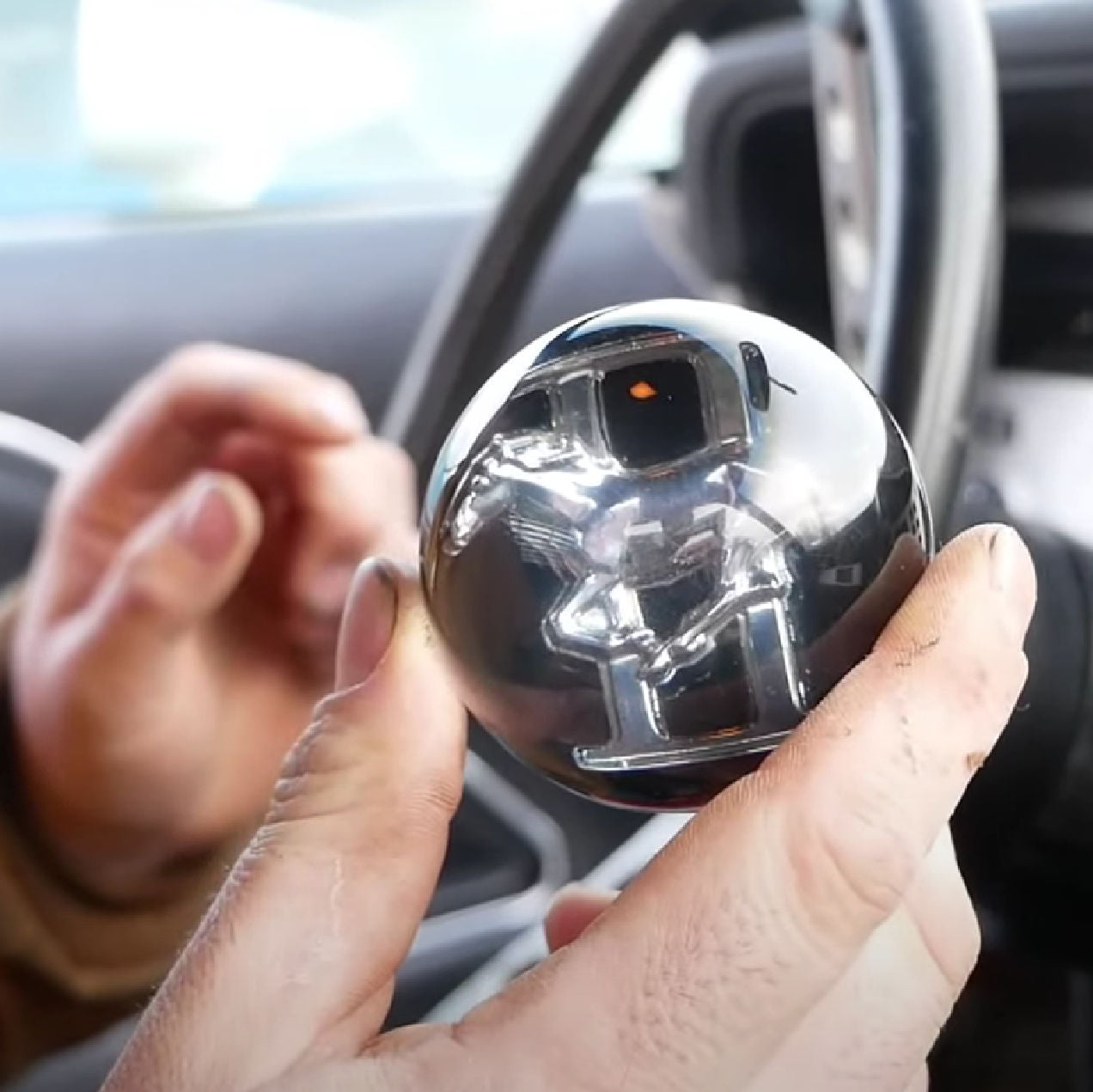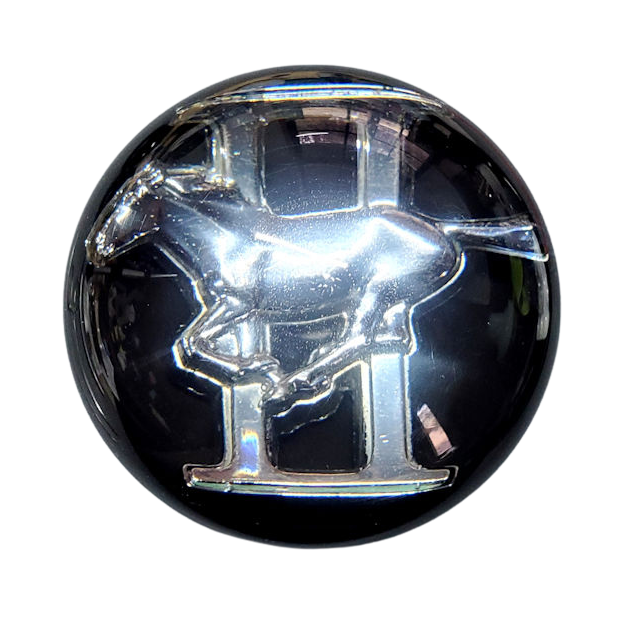 This shift knob was crafted from a 1974-78 Ford Mustang II LH Fender emblem. The emblem is larger than is typically used in a shift knob, so it sits lower in the sphere, which gives it a unique magnification effect. This is a one-off creation from a once junkyard-acquired emblem.