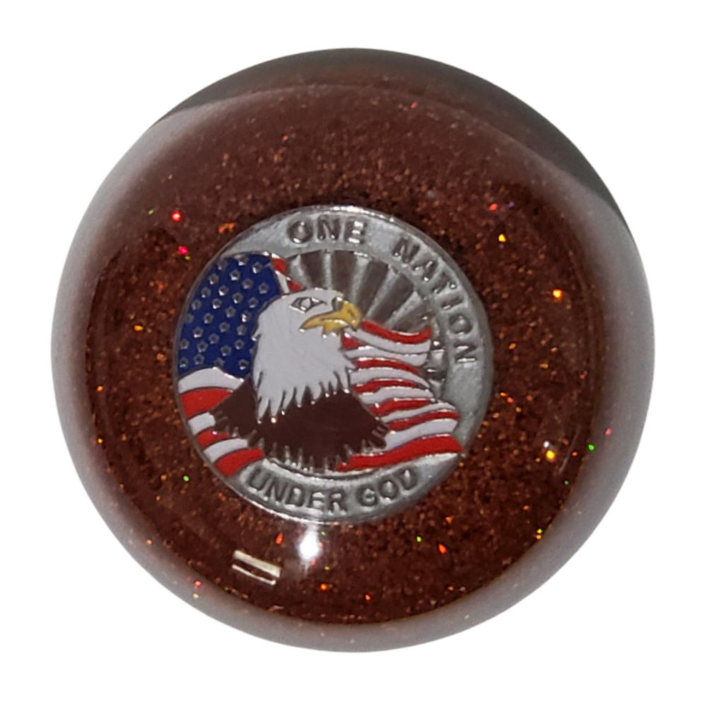 This "One Nation Under God" Shift Knob is ready for your ride. The lapel pin used certainly resembles a Quarter. The artwork includes an American Flag and Bald Eagle. The knob is 2.10 inches in diameter at the widest point and 1.85 inches at the top. The knob is 2.10 inches tall and weighs 3 1/2 ounces (99 grams).