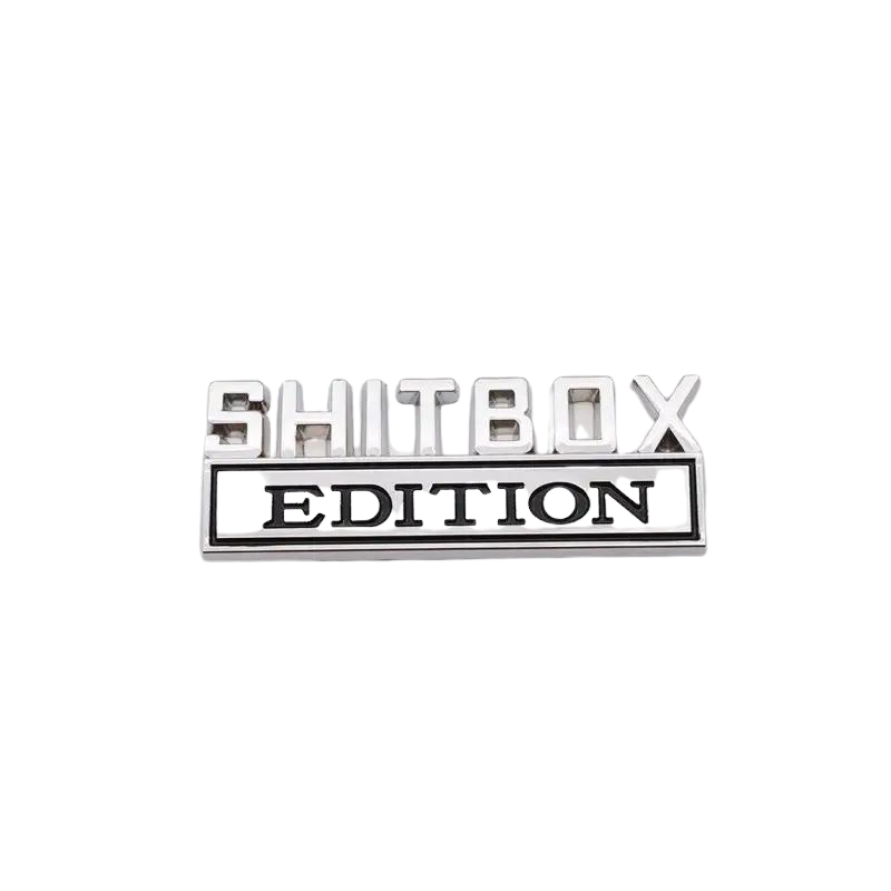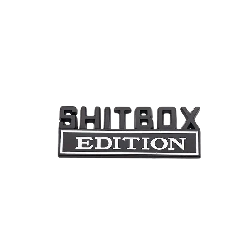 3D adhesive-backed SHITBOX EDITION emblem with red highlight. The emblem measures 3cm (1.18") x 8 cm (3.14").