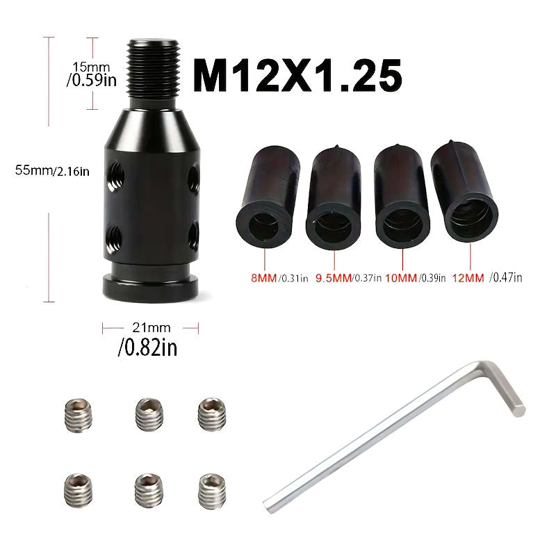 Universal Manual Gear Shift Knob Adapter for M12x1.25 threaded shifter knobs. Machined from aluminum alloy with a shift boot groove at the bottom. Available in black or silver finish. Includes 4 rubber sleeves, 6 set screws, and an Allen key for installation. If you purchase a shift knob from us with a master thread of M16x1.5, an adapter to M12x1.25 will be provided at no additional cost.