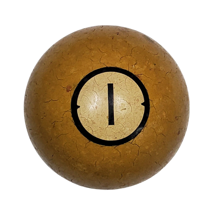 Vintage number 1 clay billiard ball, or pool ball, circa early 20th century (1920s or 1930s is our best guess). Despite the surface crackling in the photos, these balls are stout and solid. The ball can be drilled to your orientation preference: Bottom Drilled or Side Drilled. When bottom-drilled, the pool ball number sticks straight up. When side-drilled, the ball is drilled between the numbers, allowing both numbers to show left and right.