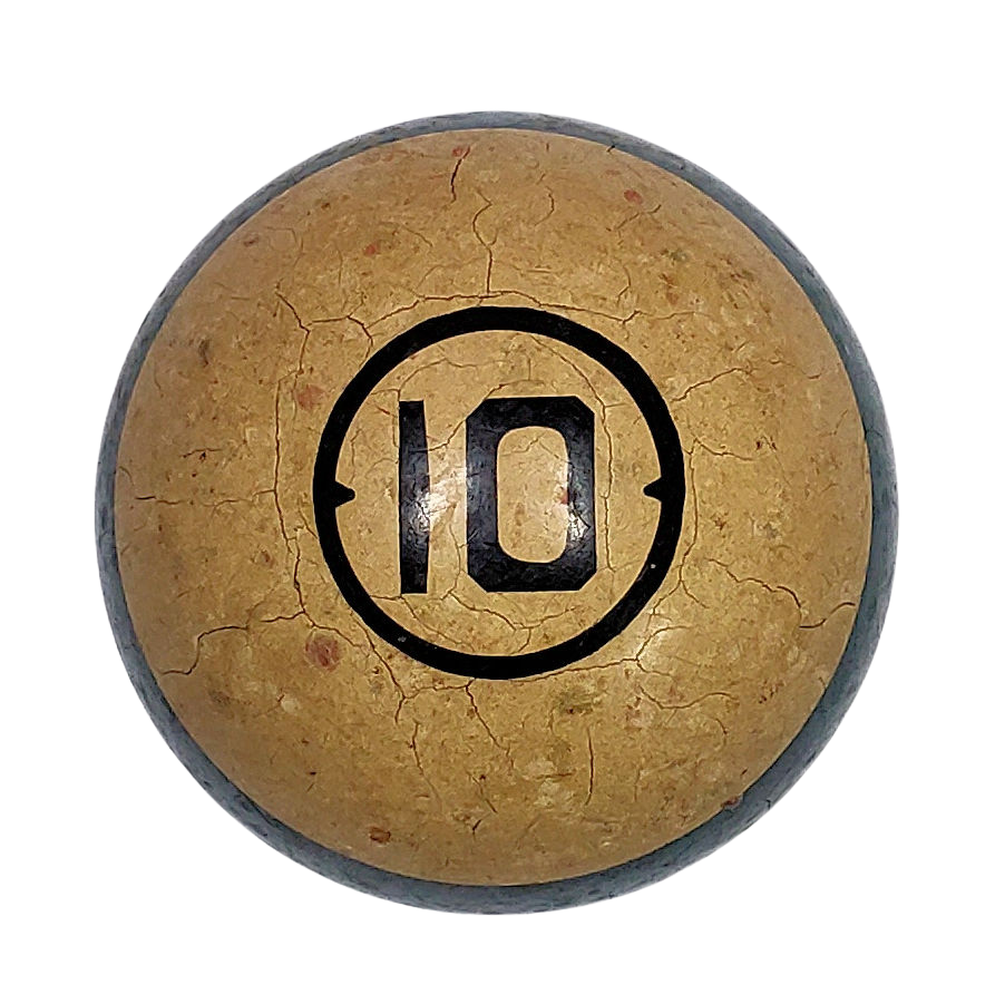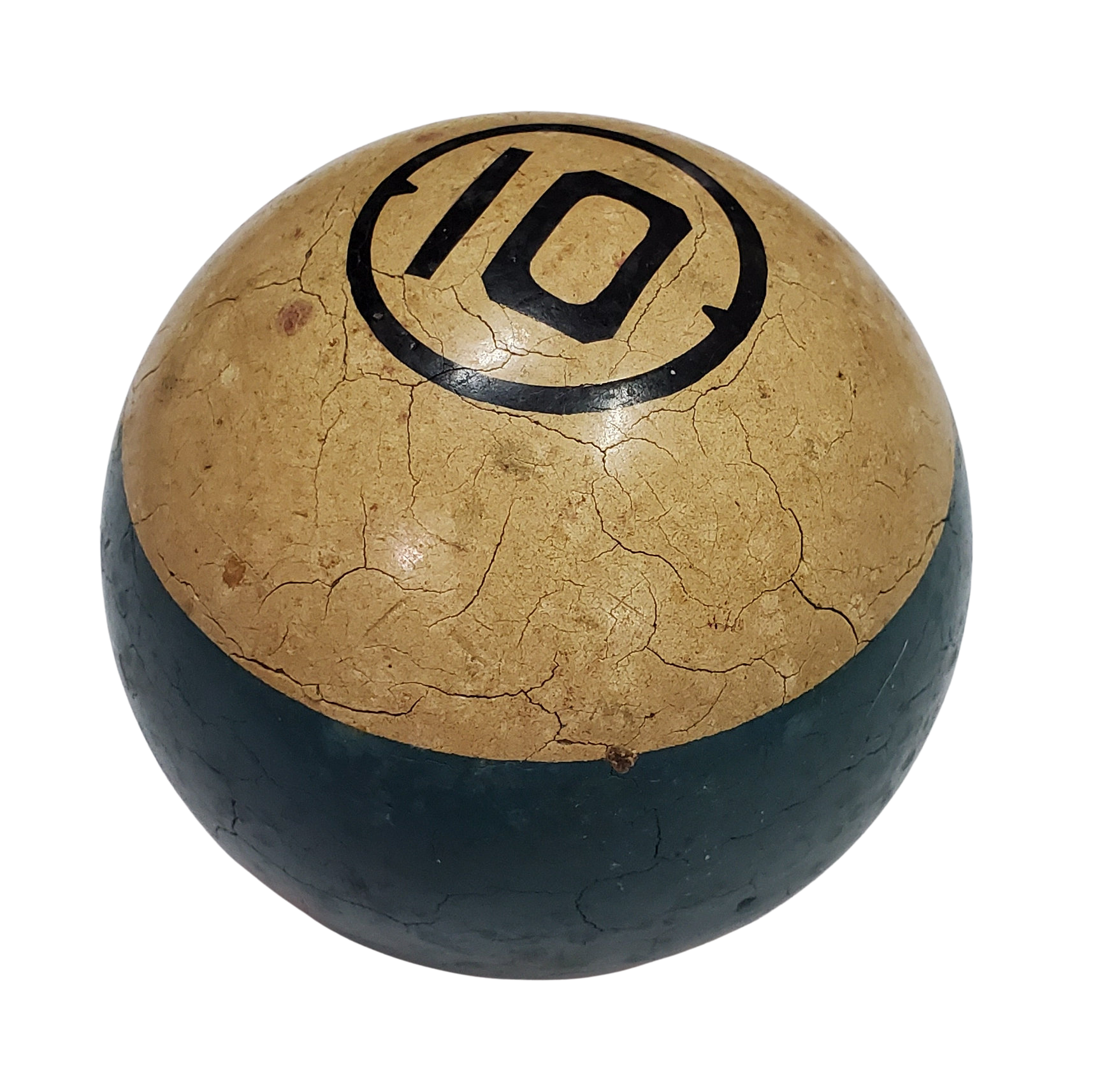 Vintage number 10 clay billiard ball, or pool ball, circa early 20th century (1920s or 1930s is our best guess). Despite the surface crackling in the photos, these balls are stout and solid. The ball can be drilled to your orientation preference: Bottom Drilled or Side Drilled. When bottom-drilled, the pool ball number sticks straight up. When side-drilled, the ball is drilled between the numbers, allowing both numbers to show left and right.