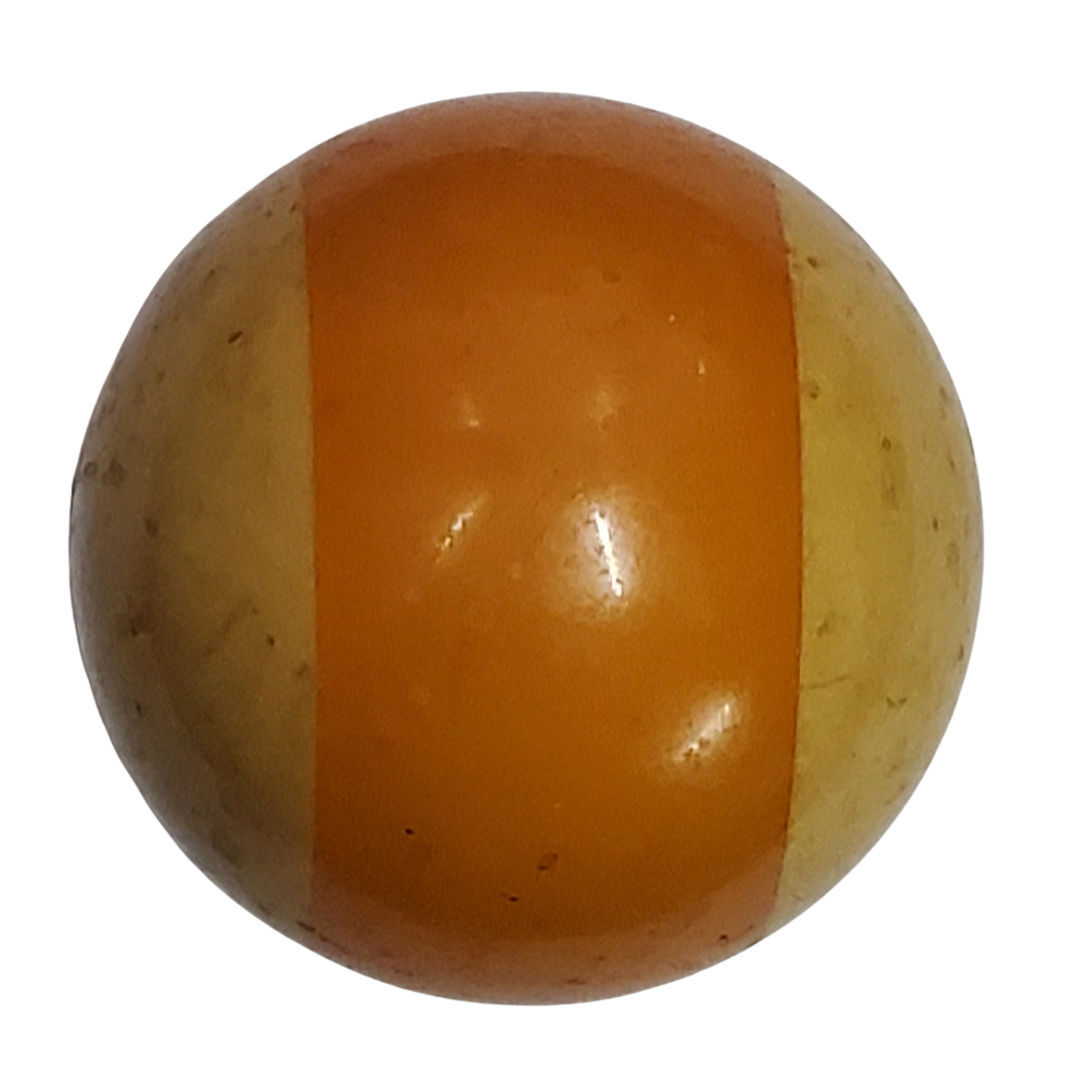 Vintage number 9 billiard ball, or pool ball, circa mid-20th Century (the 1940s-1950s is our best guess). These balls were acquired from a pool hall from the 1930s and shut down in the 1980s. The ball can be drilled to your orientation preference: Bottom Drilled or Side Drilled. When bottom-drilled, the pool ball number sticks straight up. When side-drilled, the ball is drilled in the stripe, and both numbers show left and right.